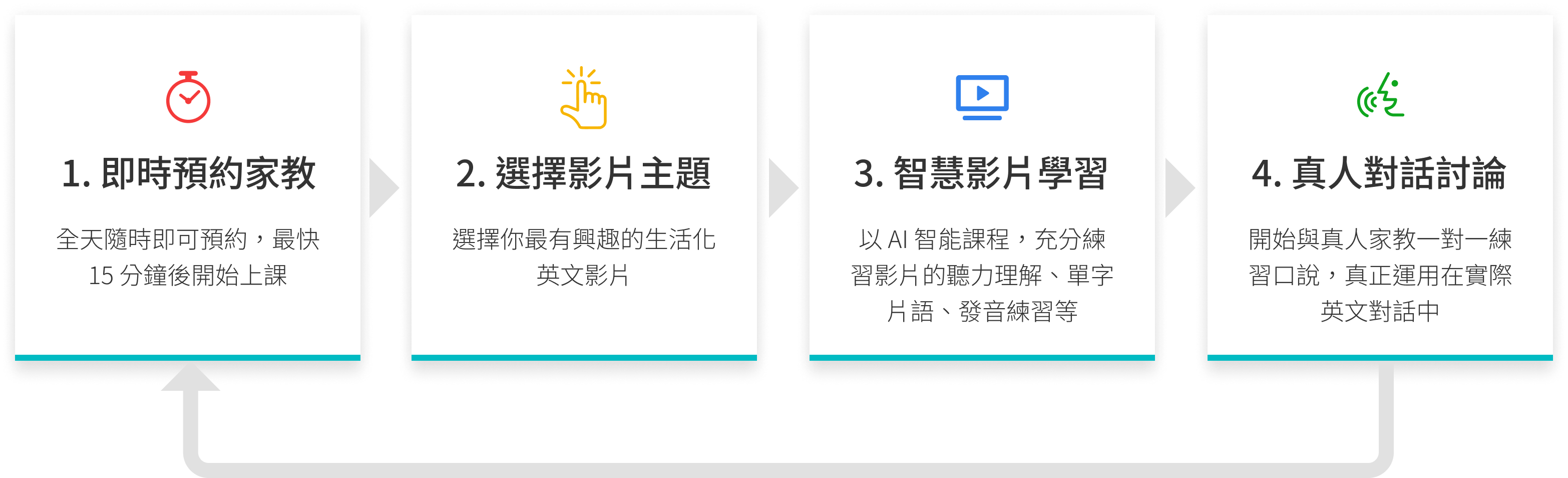 先用智能系統吸收影片教材,打好單字和聽力基礎,再和家教練習實際對話運用。